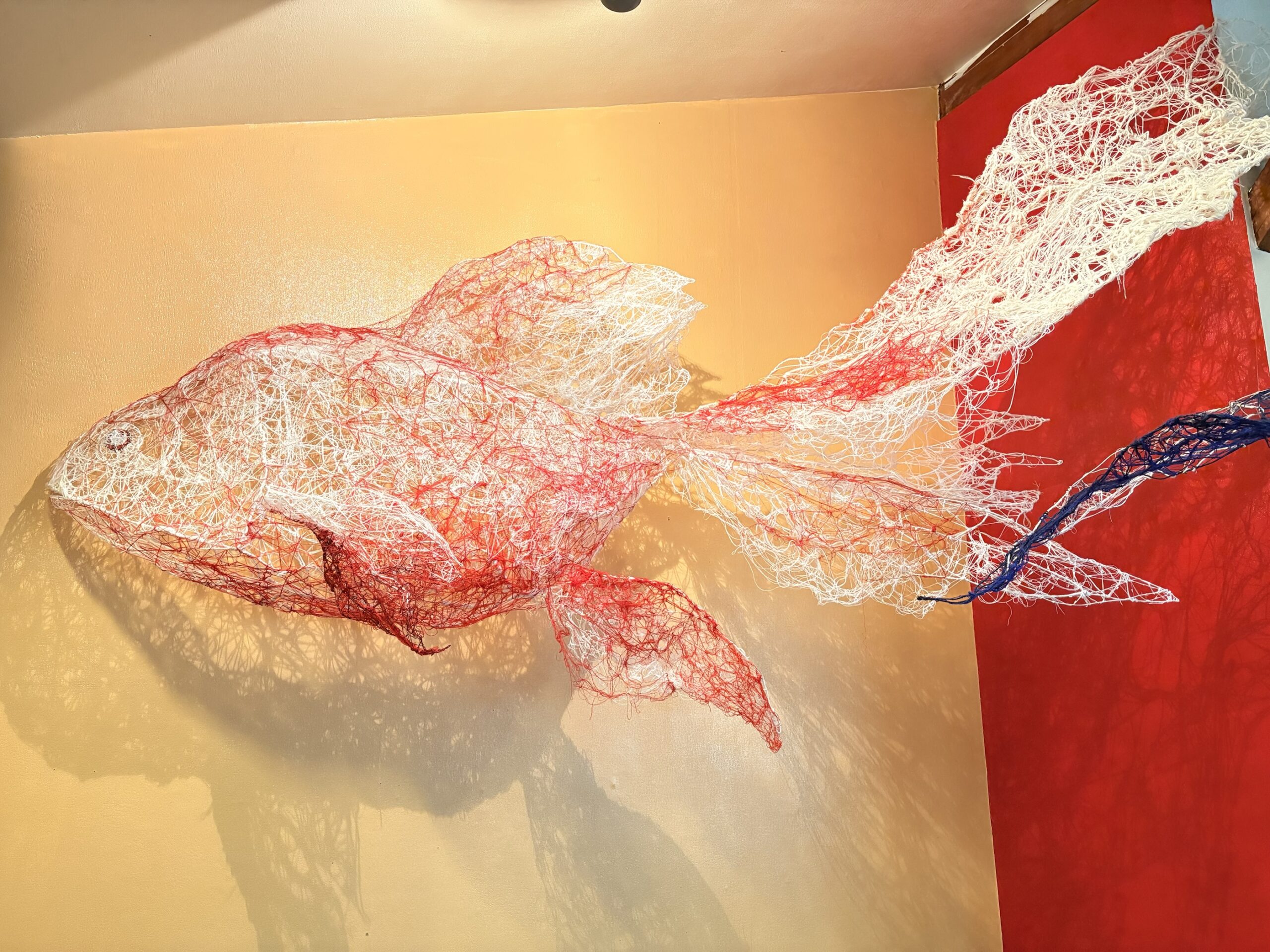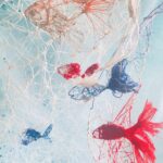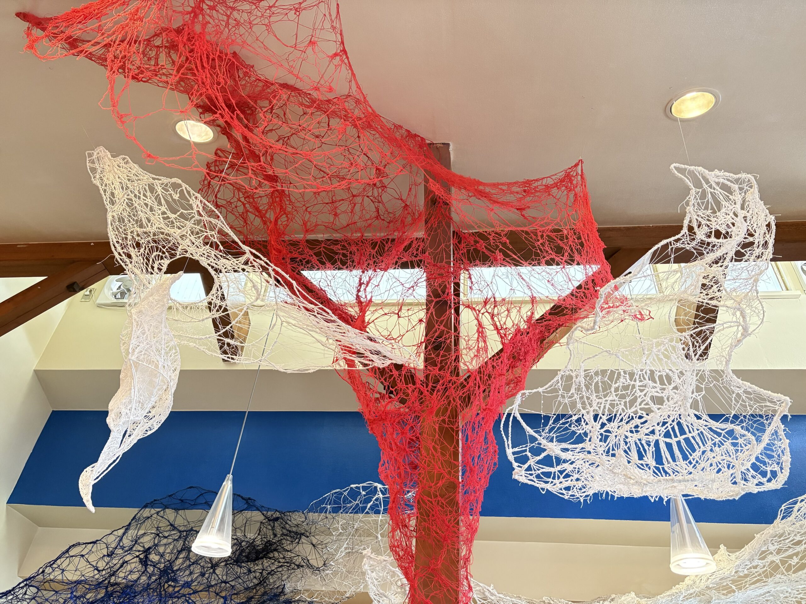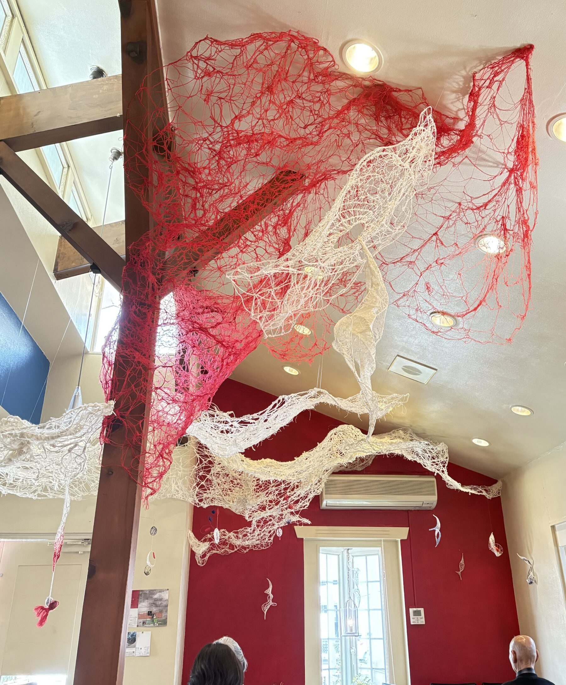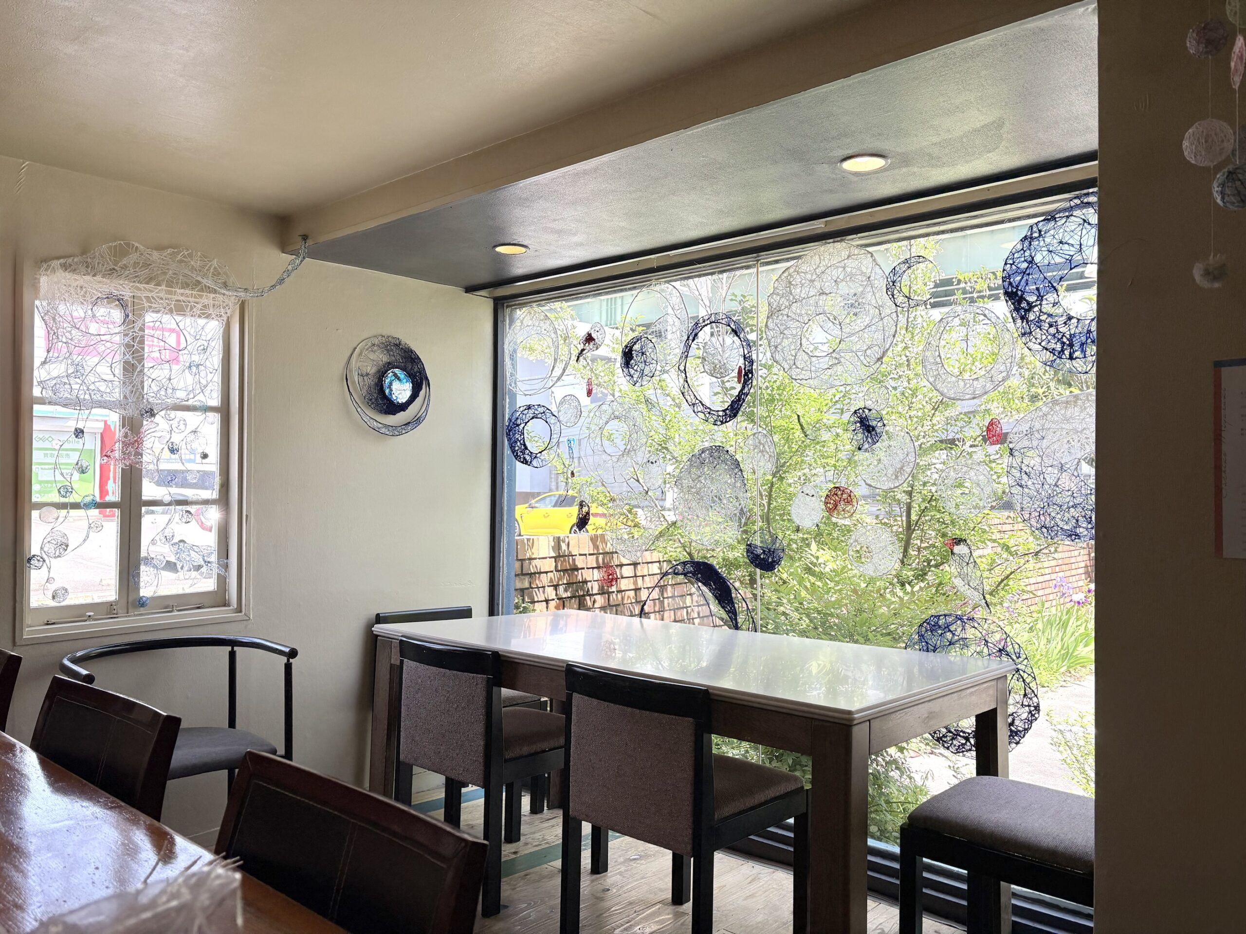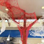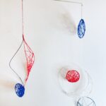 赤・青・白の糸が空間を自由に浮遊するインスタレーション作品です。48年間営まれてきた喫茶店の日常に、ささやかな彩りと新鮮な命の気配を添えたいという想いから生まれました。海の中を思わせる展示空間で、糸の流れとともに、命の営みや時間の蓄積を感じていただけたら幸いです。