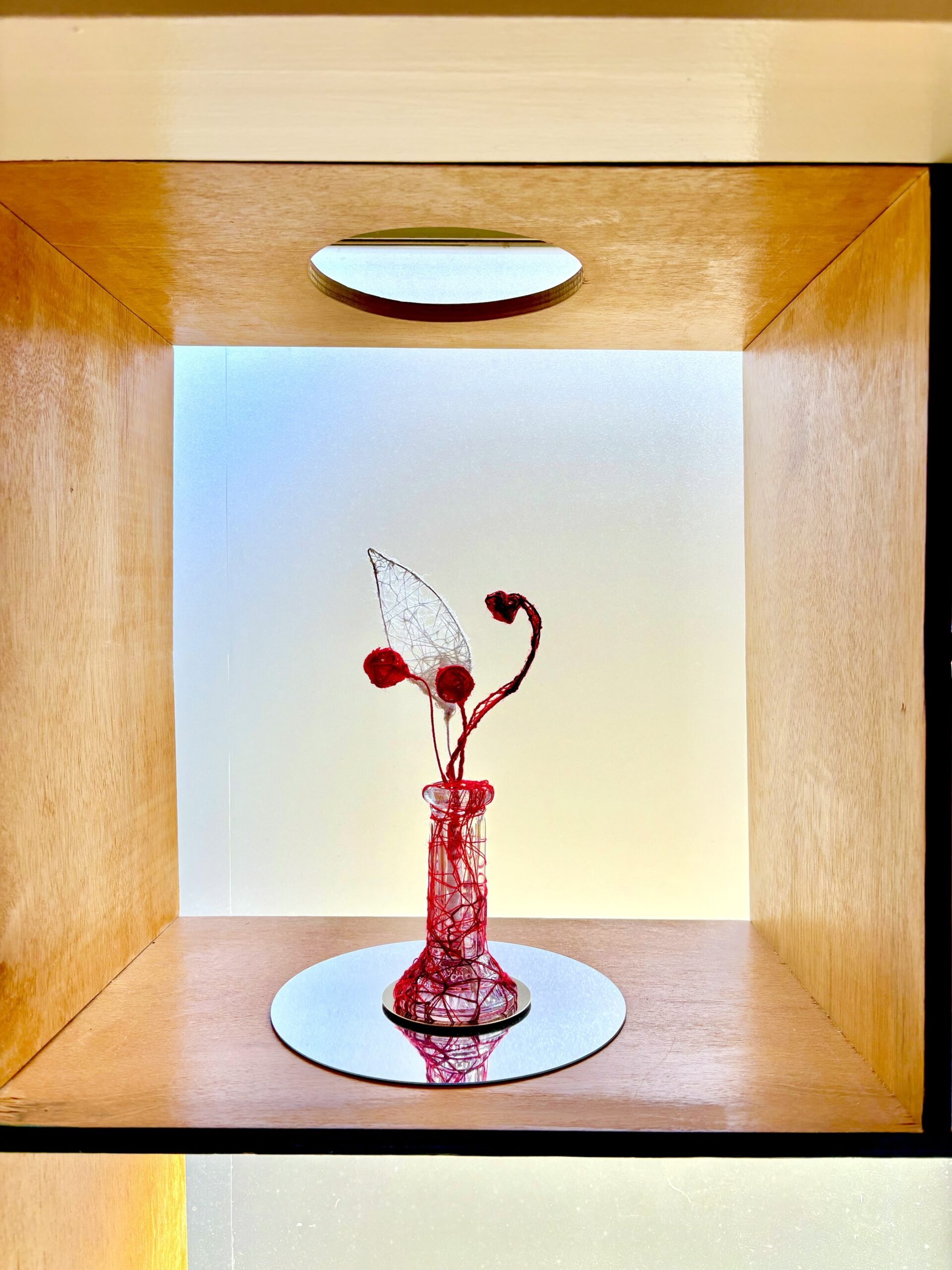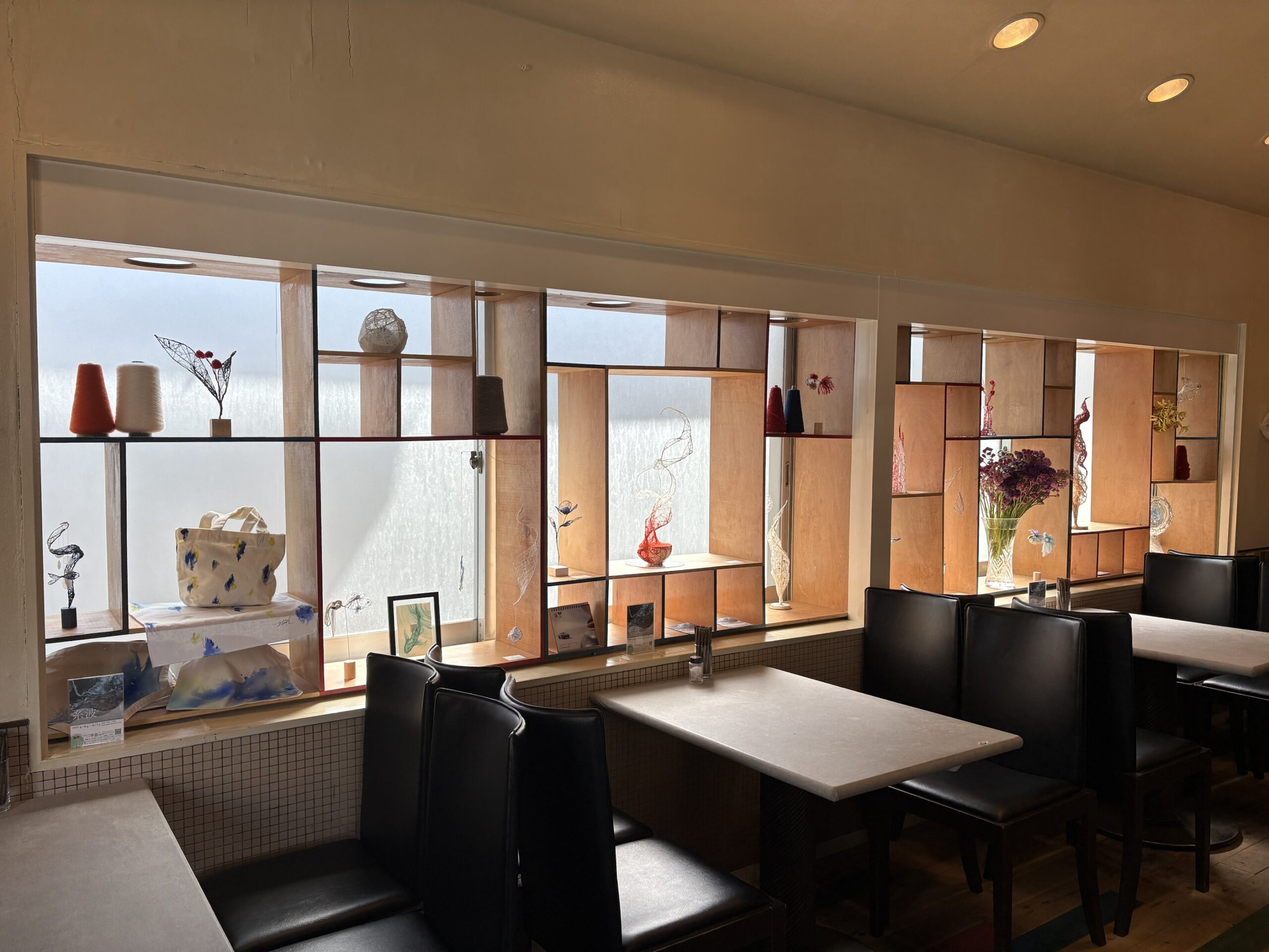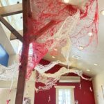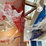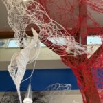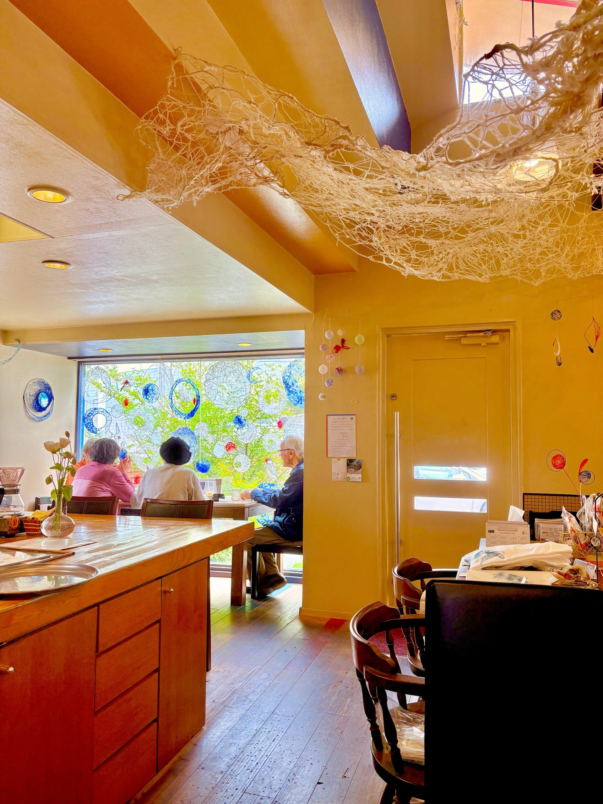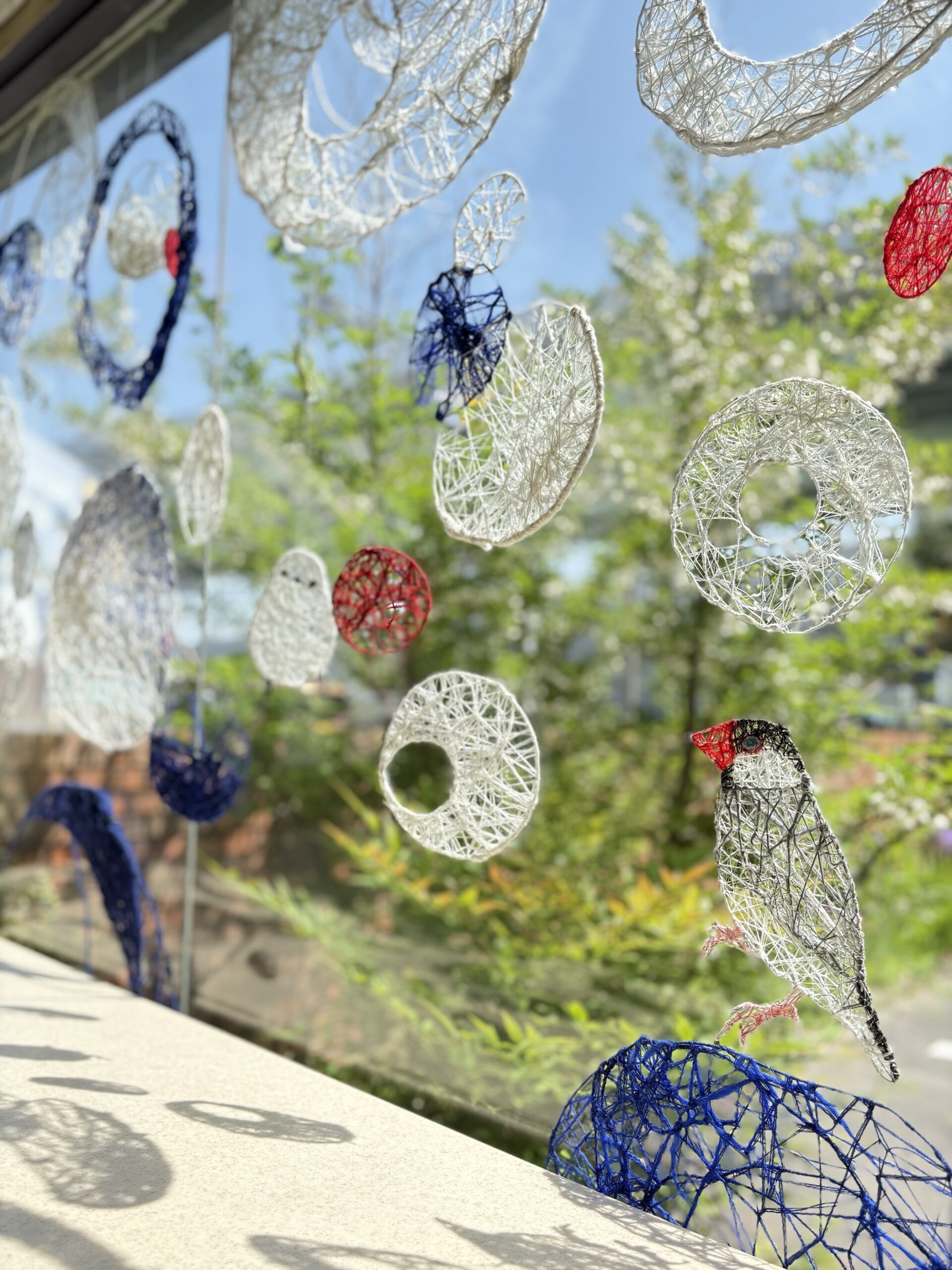 赤・青・白の糸が空間を自由に浮遊するインスタレーション作品です。48年間営まれてきた喫茶店の日常に、ささやかな彩りと新鮮な命の気配を添えたいという想いから生まれました。海の中を思わせる展示空間で、糸の流れとともに、命の営みや時間の蓄積を感じていただけたら幸いです。