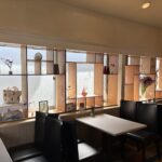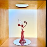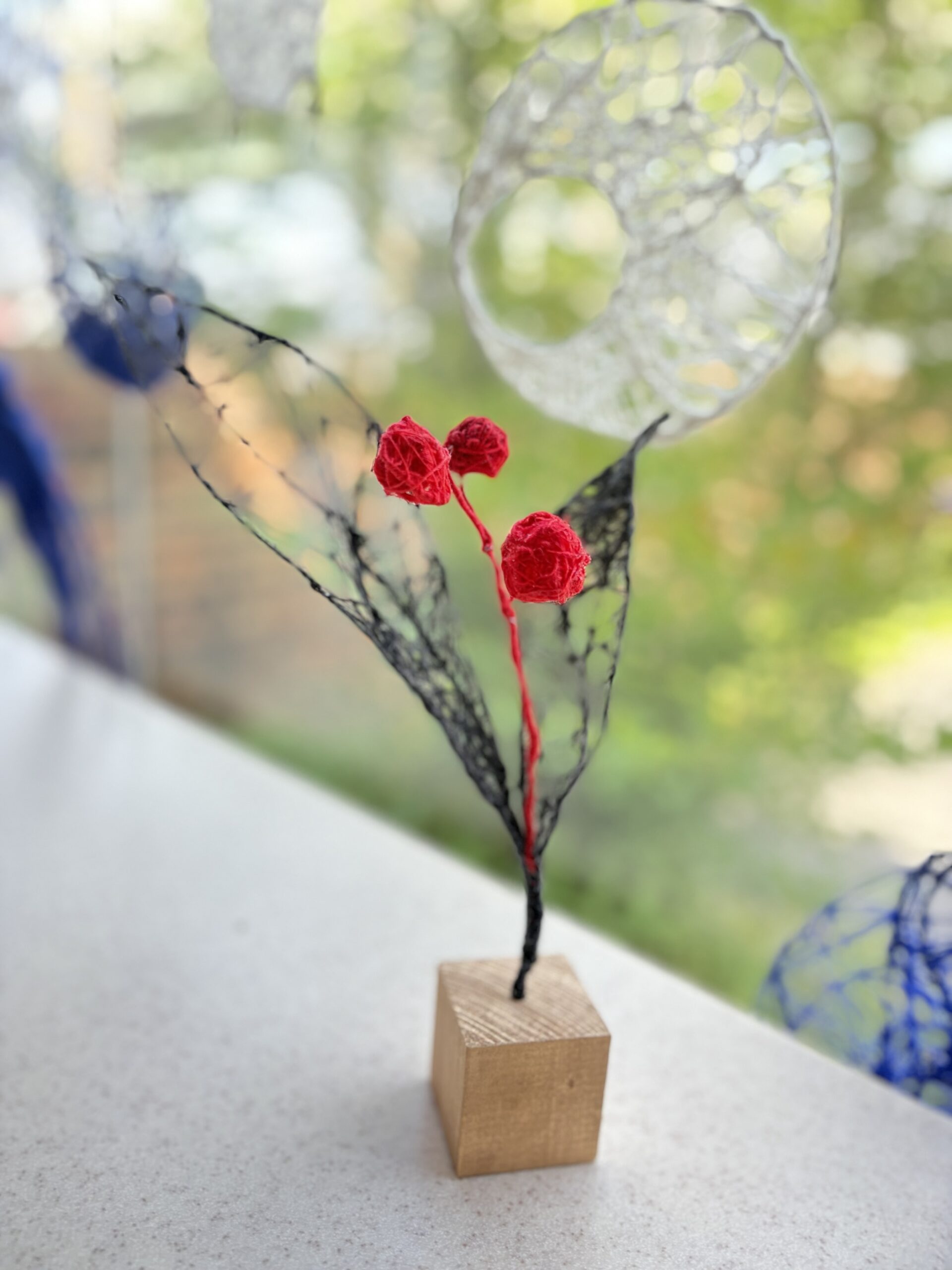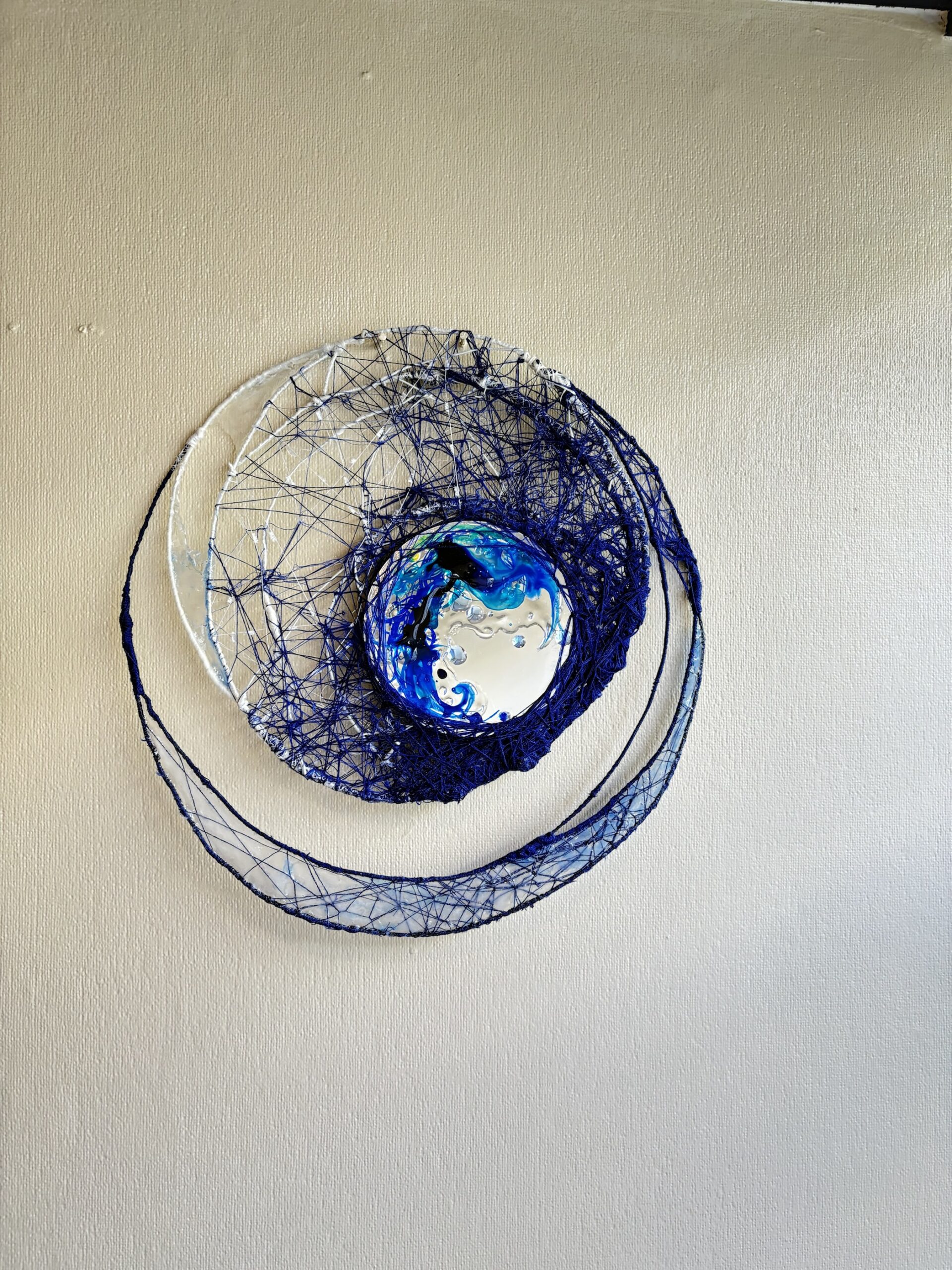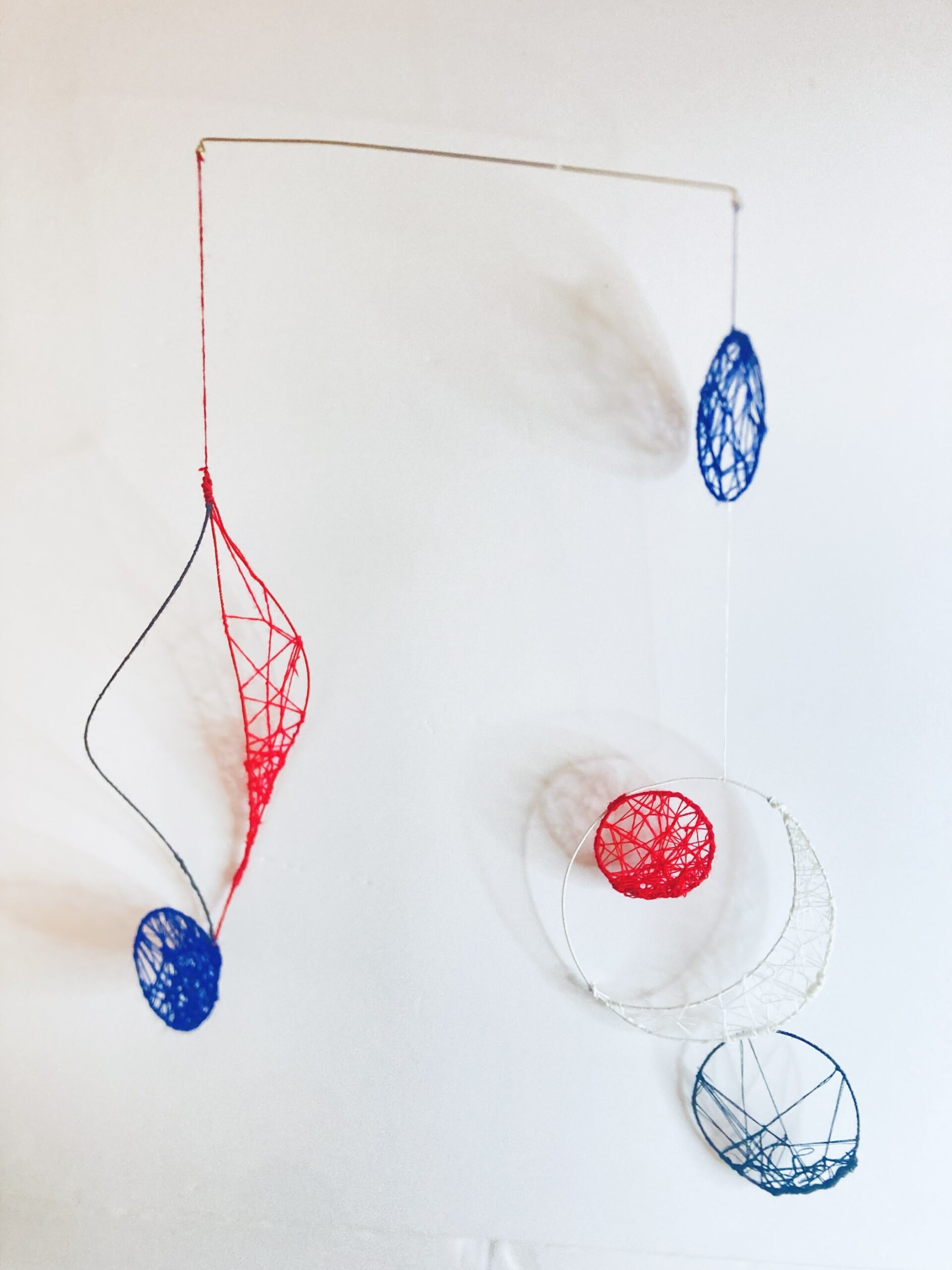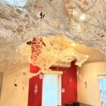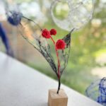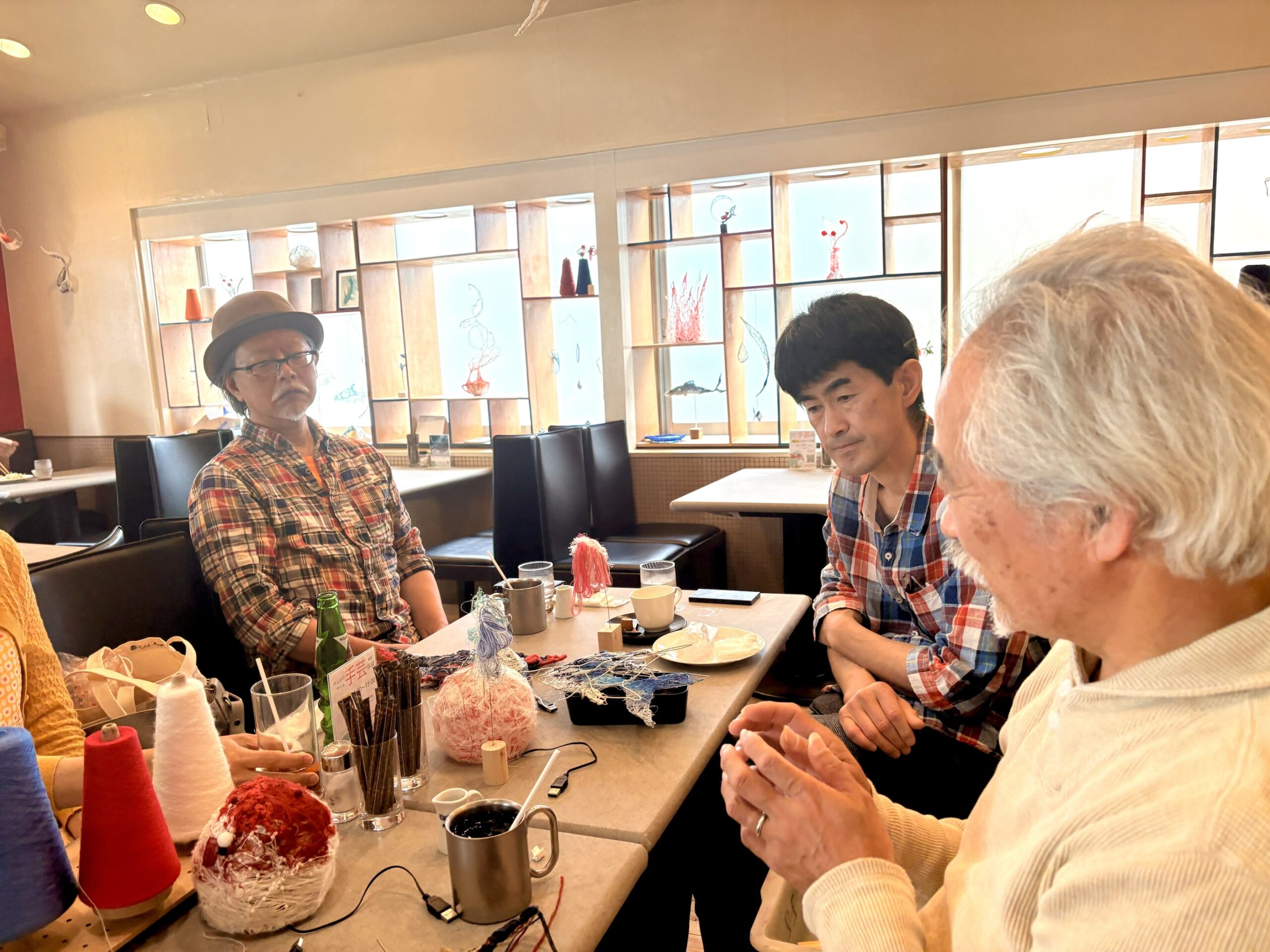 赤・青・白の糸が空間を自由に浮遊するインスタレーション作品です。48年間営まれてきた喫茶店の日常に、ささやかな彩りと新鮮な命の気配を添えたいという想いから生まれました。海の中を思わせる展示空間で、糸の流れとともに、命の営みや時間の蓄積を感じていただけたら幸いです。