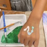 生徒は葉っぱを気に入り、ピンクブルーでスタンプ。ママのTシャツもペイントして、2枚仕上がりました。