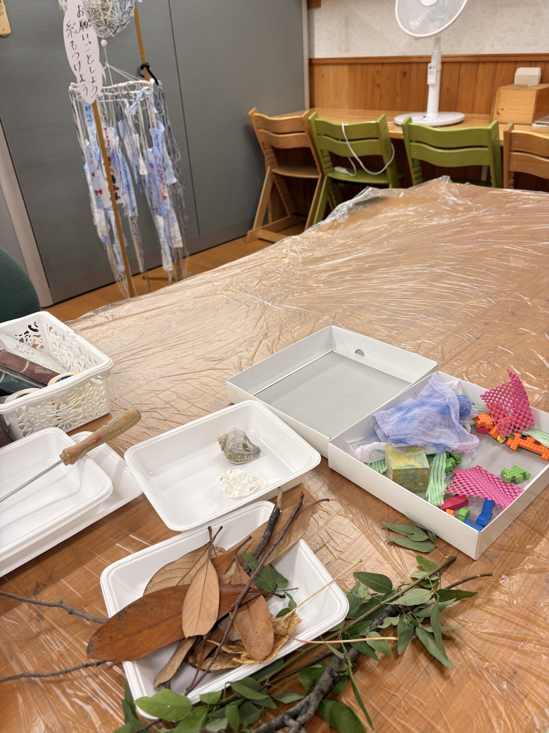 雷に大雨に、びっくりするお天気でしたが…テーマは「型を使ったTシャツペイント」