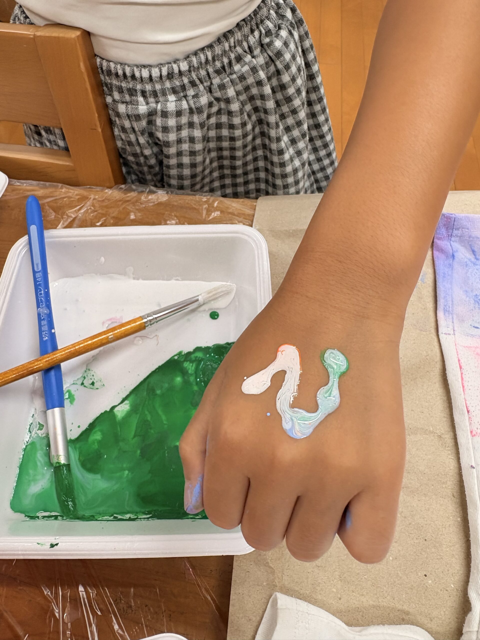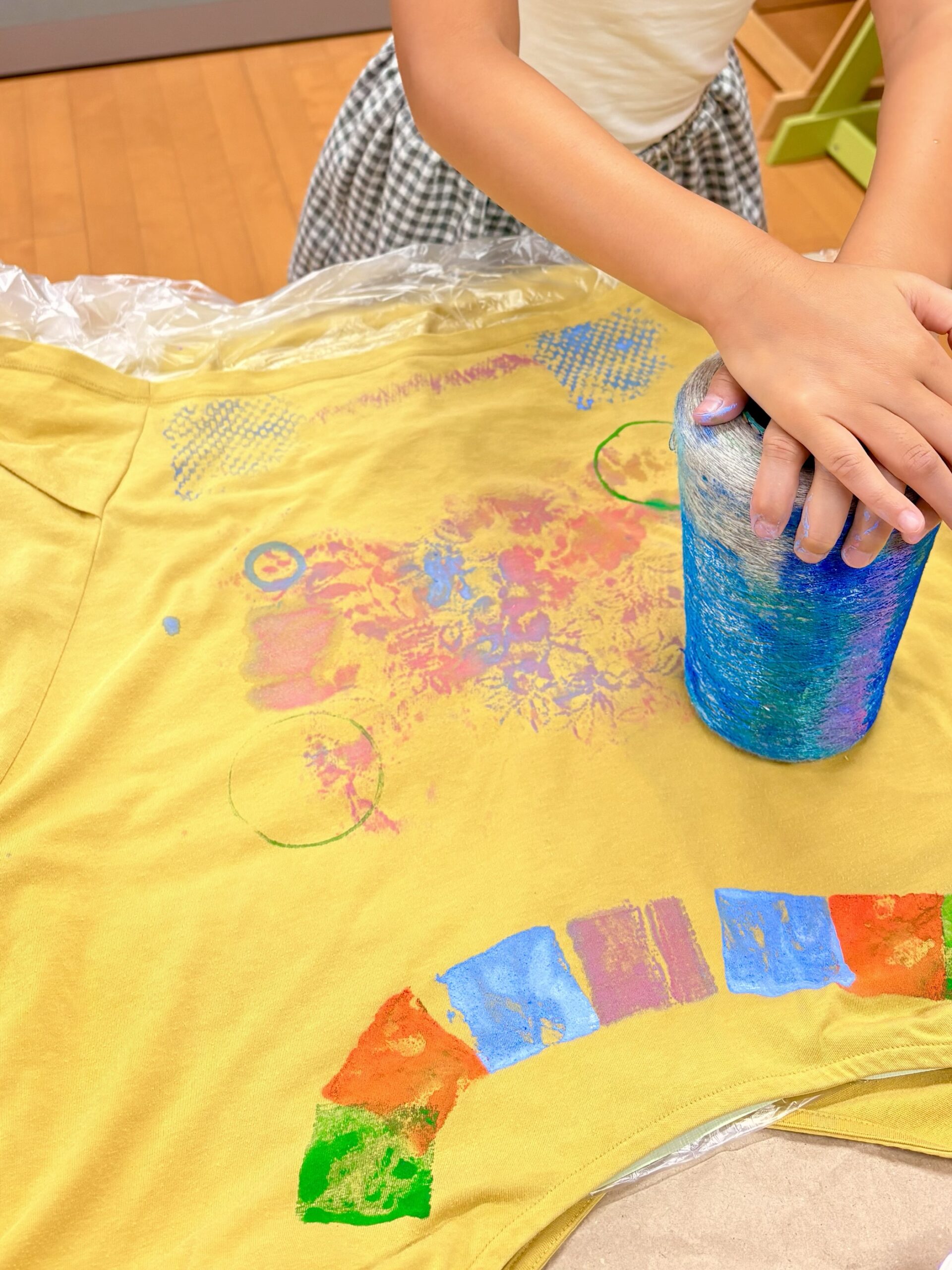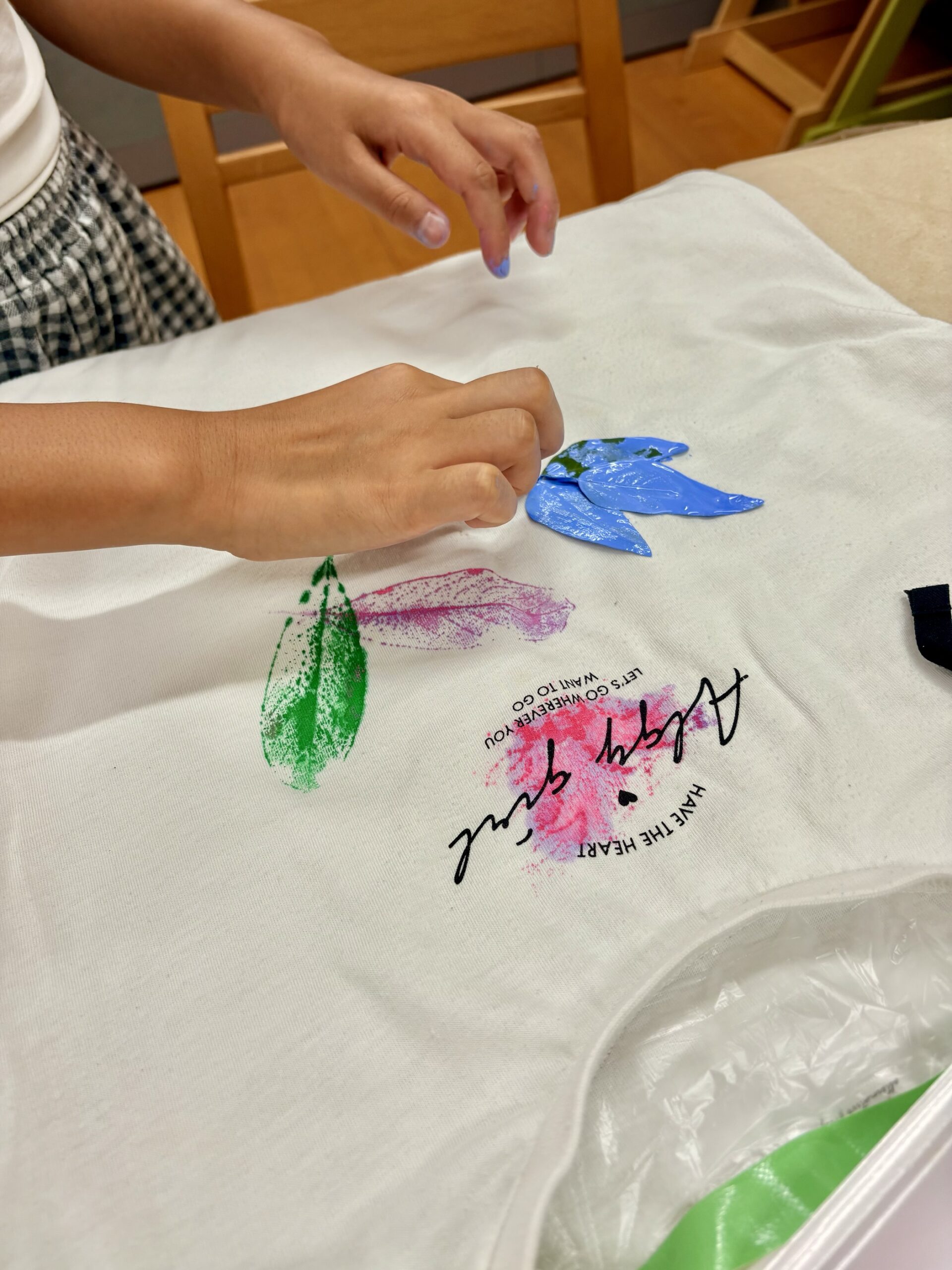 生徒は葉っぱを気に入り、ピンクブルーでスタンプ。ママのTシャツもペイントして、2枚仕上がりました。