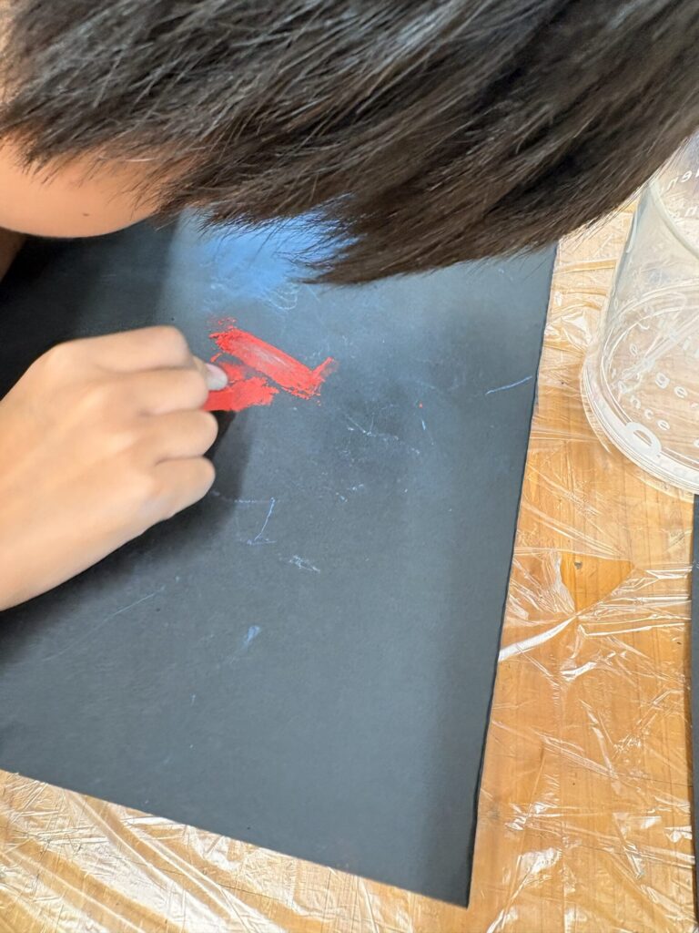後半には「パステルの粉を水に入れたらどうなるのかな?」という疑問から、小さな実験が始まりました。