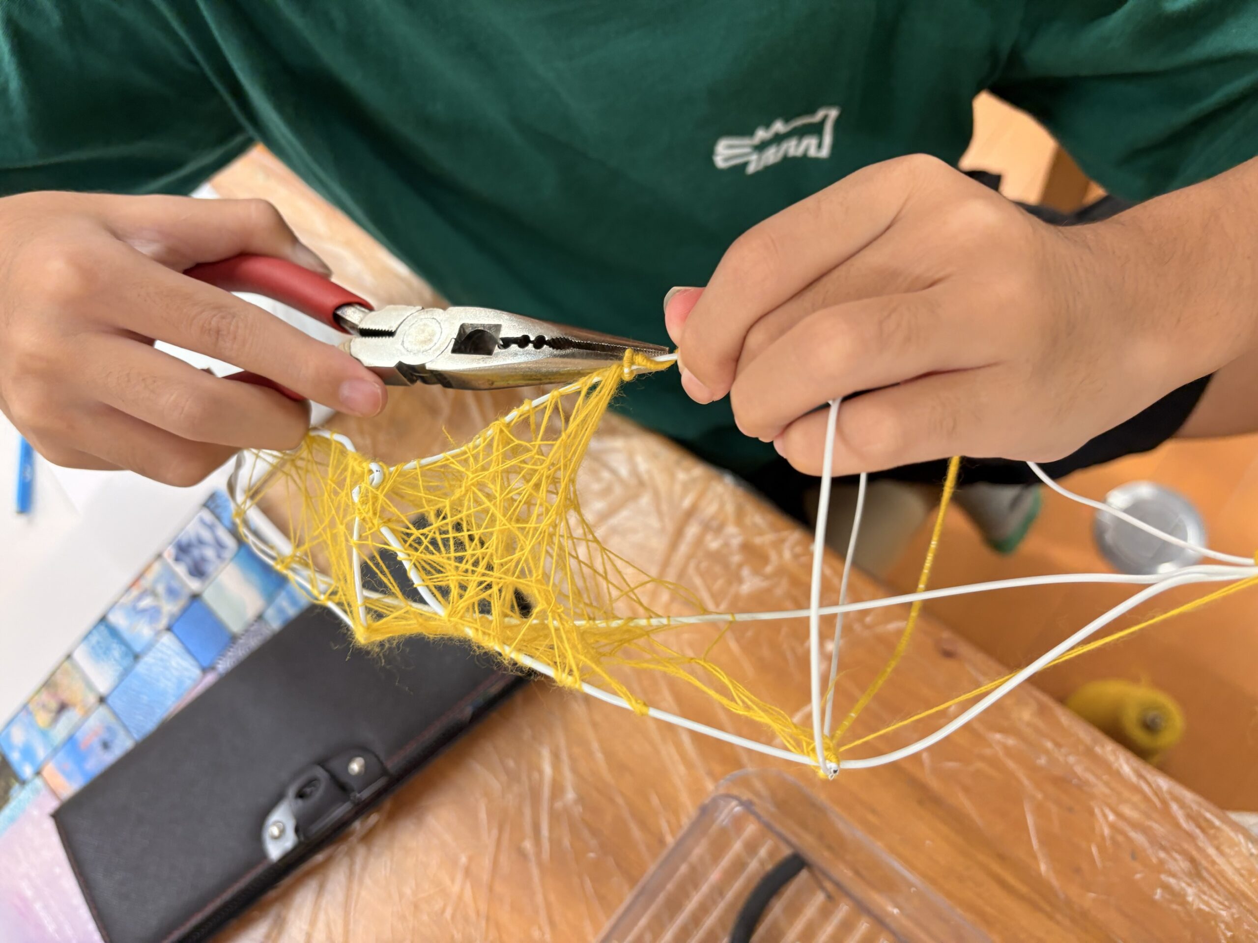 自分で針金を曲げて組み立てた土台に、気に入った糸を器用に引っ掛けていくN君。