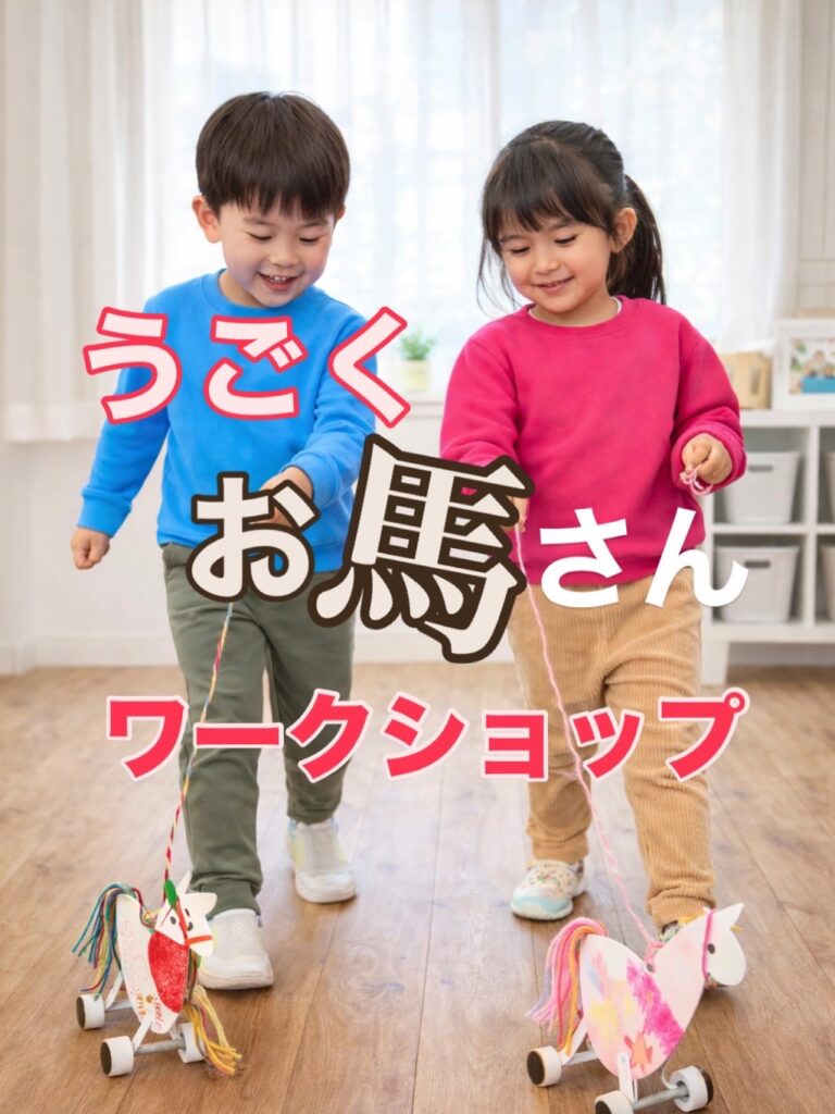 親子で一緒に、動くお馬さんを作る工作ワークショップ開催 お知らせ 2026-01-10 公文式 一宮本町校で開催出張ワークショップ 紙皿や毛糸を使って、ひもを引くと動く「お馬さん」を作ってみよう! 子どもは色をぬったり、えをかいたり。大人は、動くしかけ作りをお手伝い。親子で役割分担しながら進める工作でふ できあがったら、みんなでお馬さんを動かしてお散歩しよう!ちょっとしたあそびも楽しめるよ。
